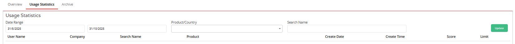 There is also the option to view your usage by Date Range, Product/Country and the Searched Name under the Usage Statistics tab.