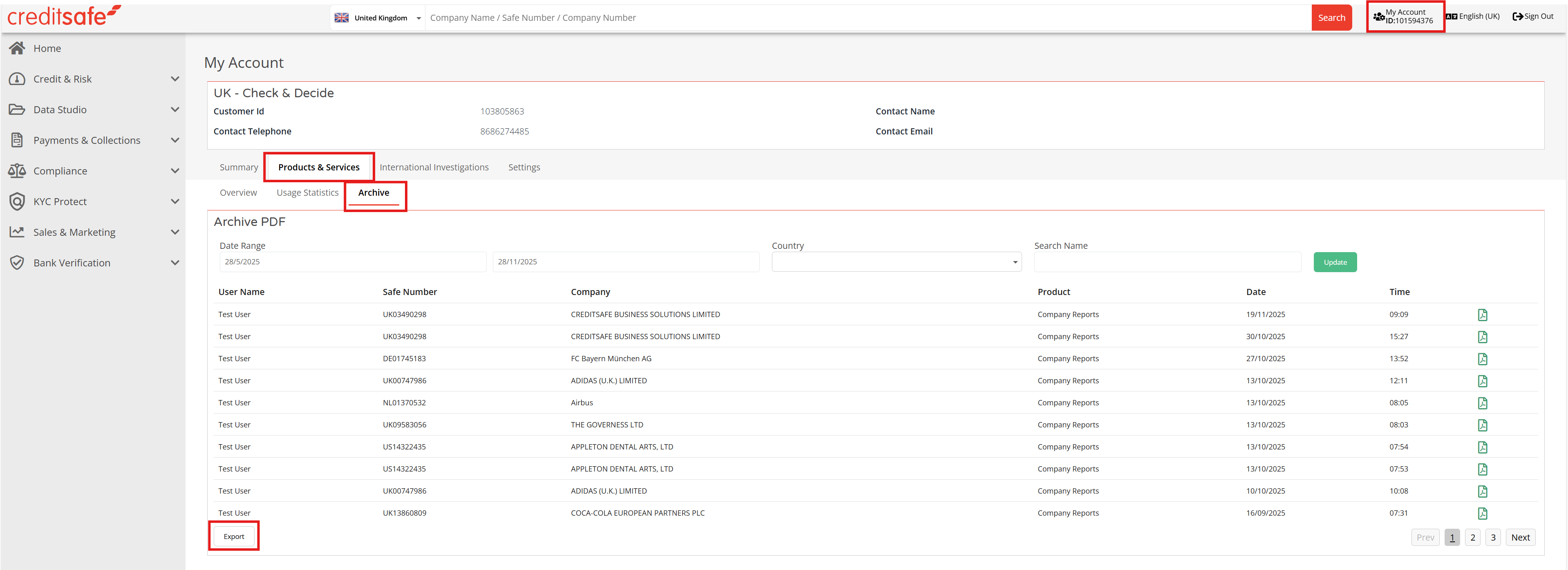 You can access a PDF history for a period of two years and a maximum of 55 reports per company by clicking on the "My Account" button in the top right-hand corner, then selecting "Products & Services" then "Archive".