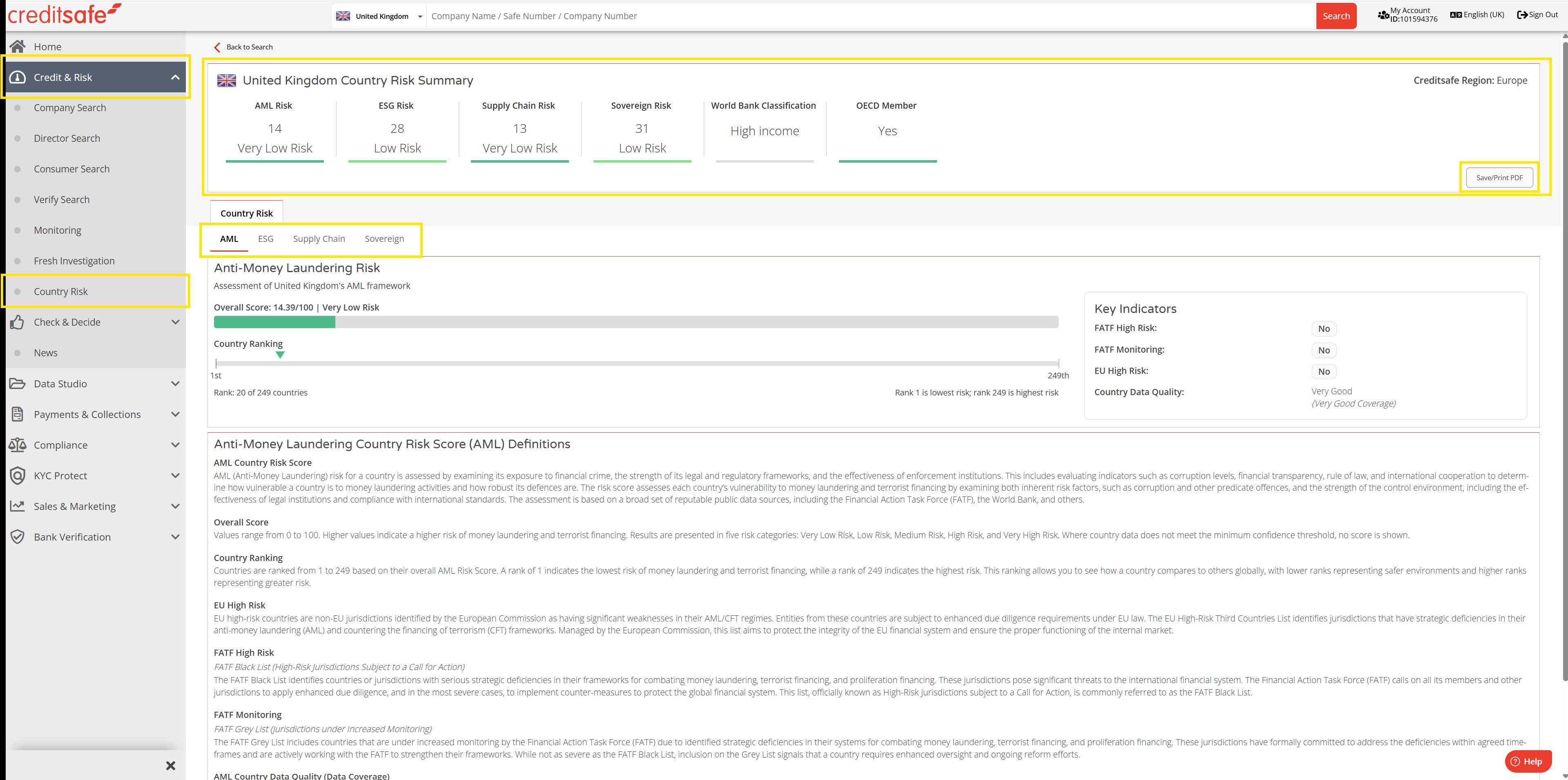 - On the Creditsafe homepage, select the Country Risk product from the left hand menu. This will be configured based on your login country